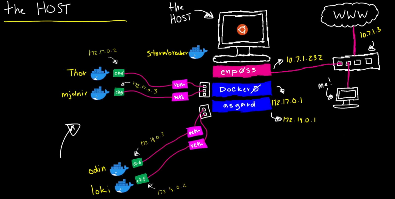 docker0is the main interface for the default docker bridge network, it’s like a network switch- for each containers in the default interface, a new virtual interface is created that is bridged to
