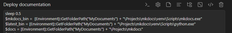 $mkdocs_bin = [Environment]::GetFolderPath("MyDocuments") + "\Projects\mkdocs\venv\Scripts\mkdocs.exe"