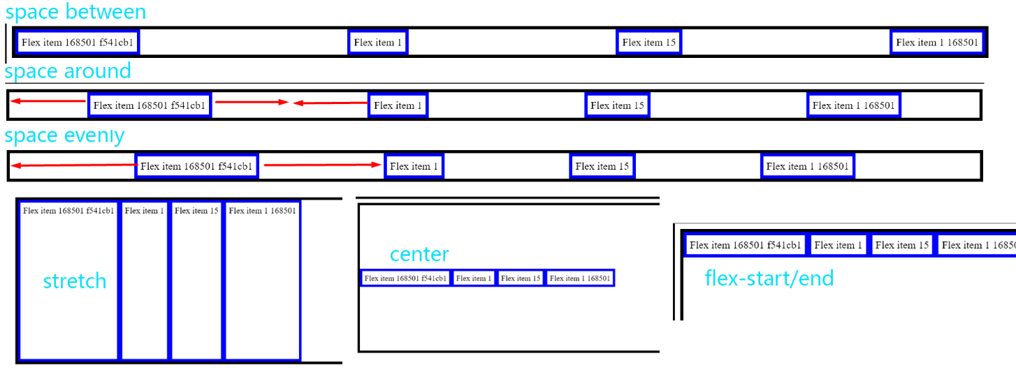 space-between: add horizontal space between but it starts and ends without spacespace-aroundadd same spacing on both horizontal side, the space between flex items is 2x of the space between flex border and itemspace-evenly: the spaces between any element is the same- since by default flex is horizontal, if a flex is vertical, the the