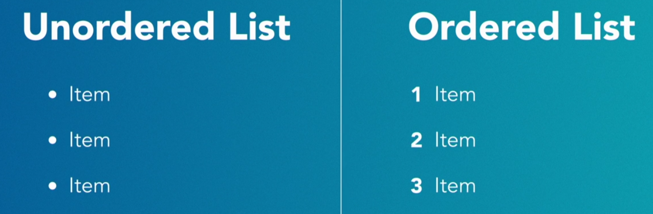 Lists starts with <ul> or <ol> and each individual items in a list are <li>